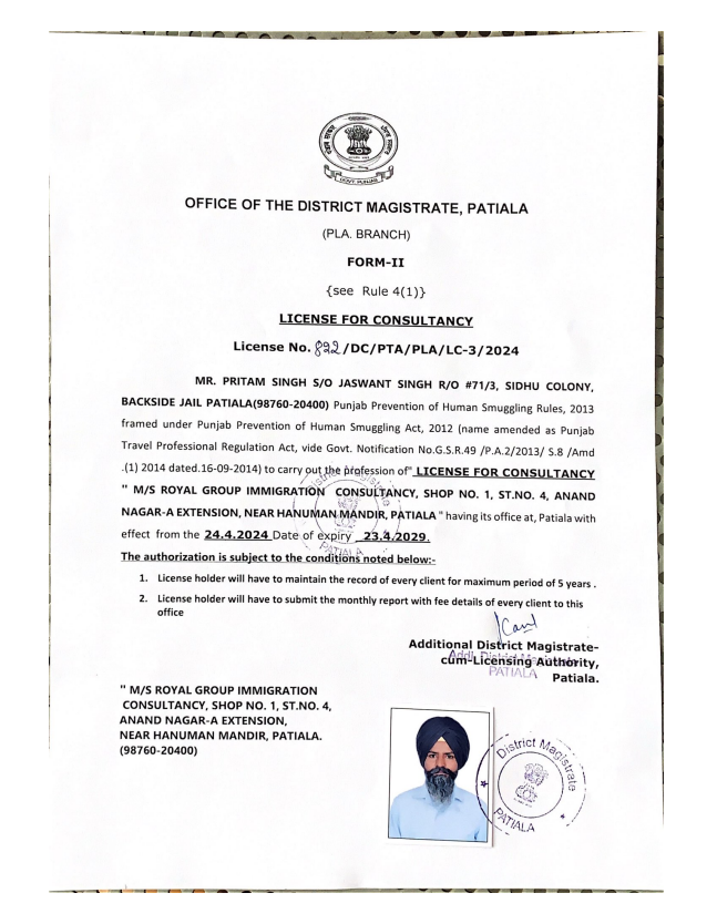 Issued by the Office of the District Magistrate, Patiala, this license authorizes Royal Group Immigration Consultancy to provide professional immigration consultancy services.