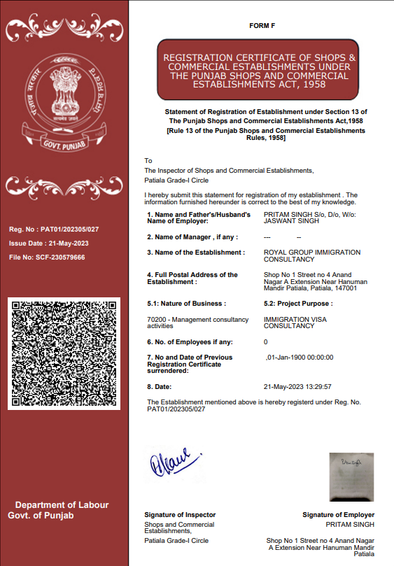Royal Group Immigration Consultancy operates under official government registration and provides professional immigration consulting services with transparency and compliance.